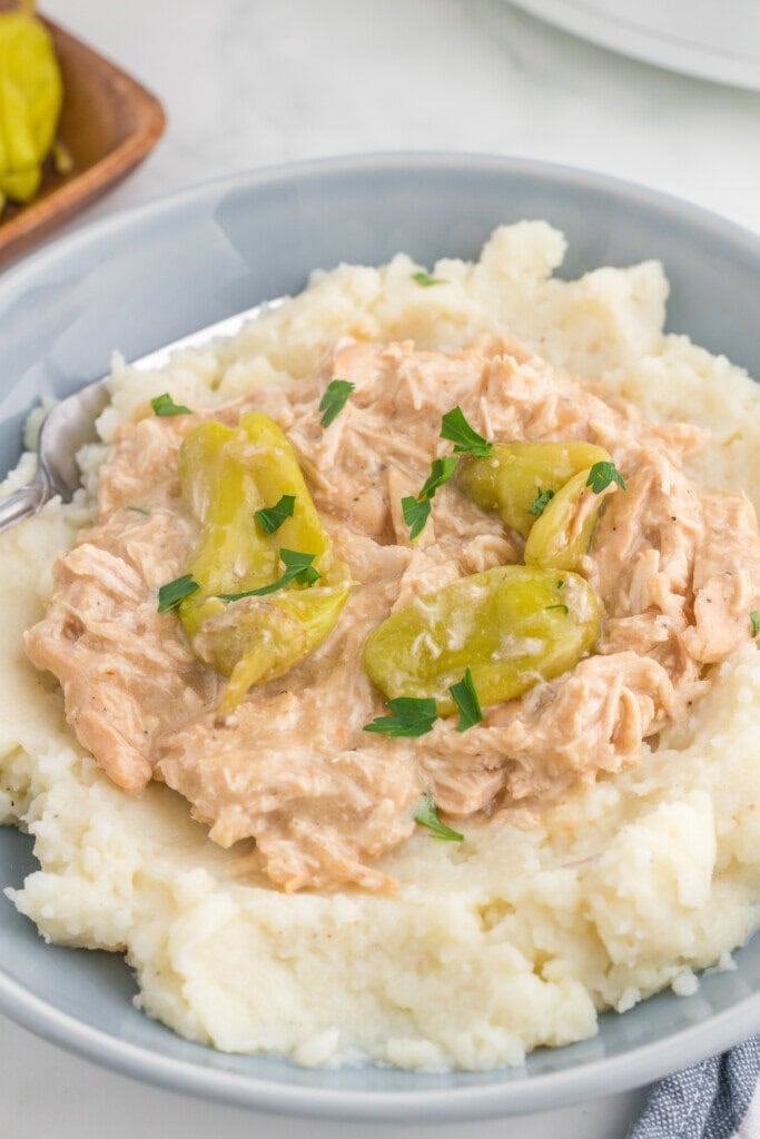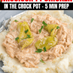5-ingredient Crock Pot Mississippi chicken might be one of the easiest dinners you’ll make. It’s a knockoff of the pot roast version, but we love it because it’s so quick to prep and doesn’t require many ingredients. The recipe is filled with flavor, and you only need 5 ingredients (not including salt and pepper). All you need is chicken, broth, pepperoncinis, onion soup mix, and ranch dressing. It only takes 5 minutes to prep and put it in the Crock Pot.