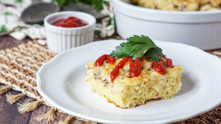 Makaronilaatikko (Finnish macaroni casserole) features macaroni noodles and ground beef and are coated in a creamy egg mixture, topped with cheese, and baked until golden and bubbly.
