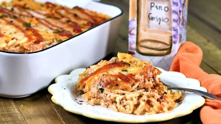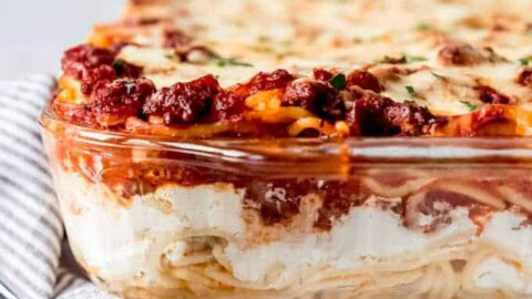 This creamy, cheesy ground beef-baked spaghetti casserole recipe is a wonderfully easy dinner idea for any night of the week. It’s a great comfort food addition to your next family gathering, potluck, or dinner time.