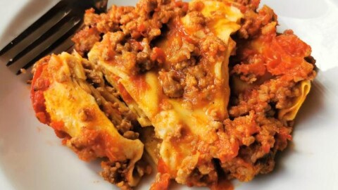 Traditional baked fazzoletti pasta recipe from Abruzzo is a fabulous alternative to lasagna. It's made with homemade handkerchief pasta squares and ground beef and sausage ragu. An authentic Italian pasta recipe that all the family will love.