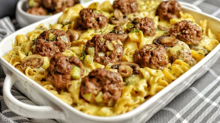 This creamy and savory meatball and mushroom pasta will go great on any dinner table on any day of the week. A creamy pasta casserole topped with savory meatballs — a tasty dinner idea!
