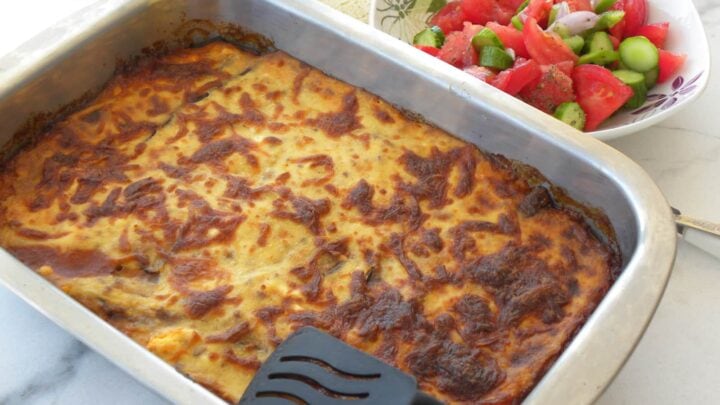 Pastitsio is a Greek baked pasta dish with meat sauce between two layers of tubular pasta and topped with bechamel sauce.