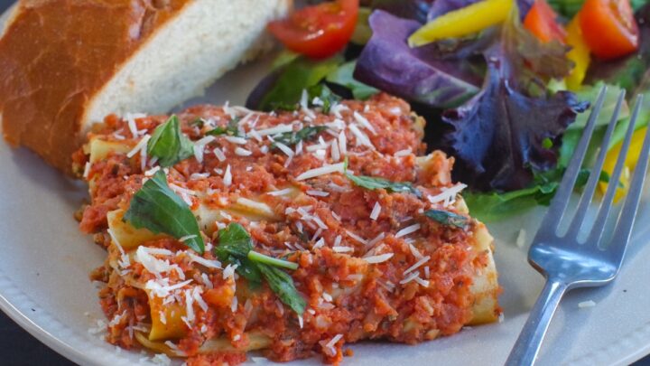 Baked beef cannelloni, made with oven-ready pasta, has a unique filling comprised of ground beef, spinach, carrots, fresh basil, and no ricotta. The whipping cream and wine make it rich and delicious. It's the perfect, make-ahead, special and company-worthy dinner recipe. You will love this great recipe.