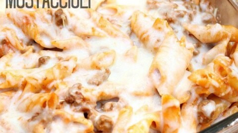 Baked Mostaccioli is a super simple and tasty baked pasta with a blend of marinara and Alfredo sauces. With only five ingredients, it comes together fast and is perfect for an easy dinner!
