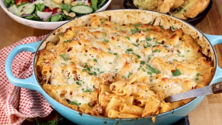 Hearty baked penne pasta is perfect for a hungry crowd or to take to a potluck. Packed with ground beef, Italian sausage, veggies, bits of velvety cream cheese, and shredded cheese, it's the ultimate comfort food.