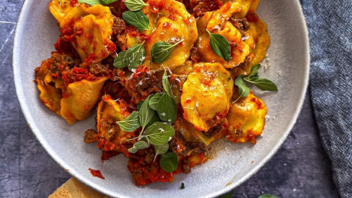 You only need four ingredients for this cheesy pasta with ravioli and ground beef. The slow cooker meal can also be baked in the oven for a delicious family meal.
