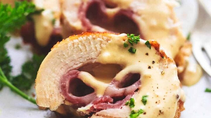Bring out your inner chef by rolling ham and Swiss cheese into chicken breasts, coating with breading, and baking to a crispy texture. The Dijon cream sauce is swoon-worthy, especially with a potato side dish such as the twice baked ones.