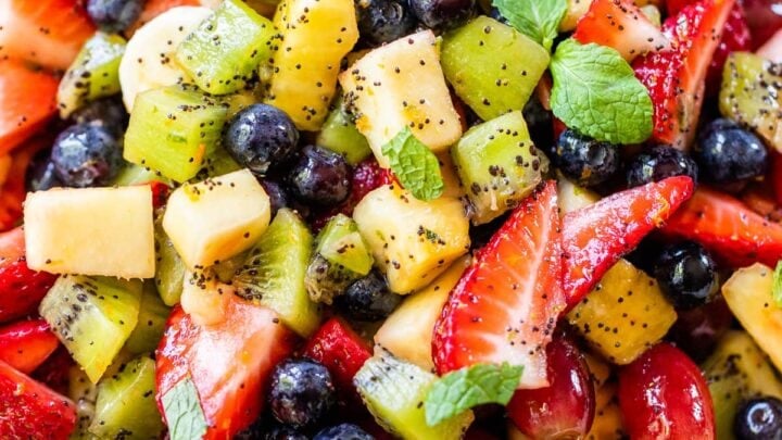 Talk about a great flavor combo, this fruit salad features strawberries, pineapples, blueberries, kiwi, grapes, and bananas in a mouthwatering dressing. Orange zest, honey, poppy seeds, and a few other ingredients make up the dressing that everyone at the party will love.