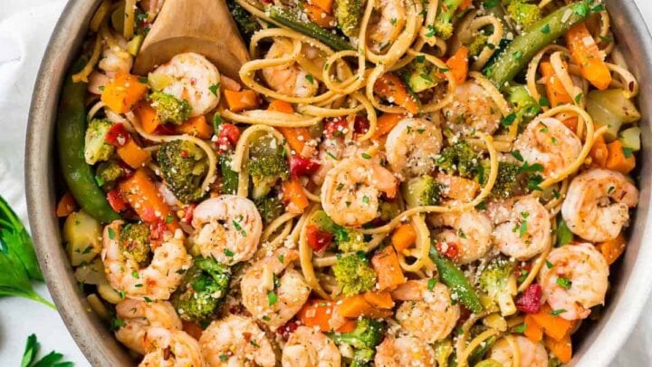 If you're looking for a more wholesome pasta dish, this recipe for garlic shrimp pasta is right up your alley. It's full of amazingly delicious ingredients including shrimp, pasta, fresh vegetables, white wine, and more.