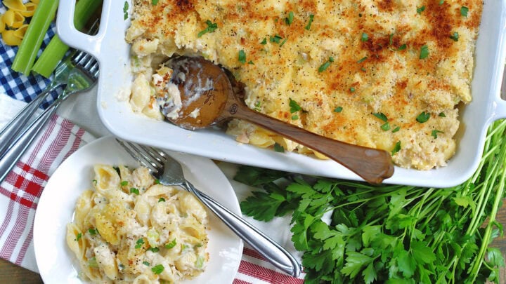 Tuna noodle casserole is a great dish for family and friends. The cheesy creamy dish is easy to make and takes less than an hour to make.