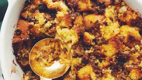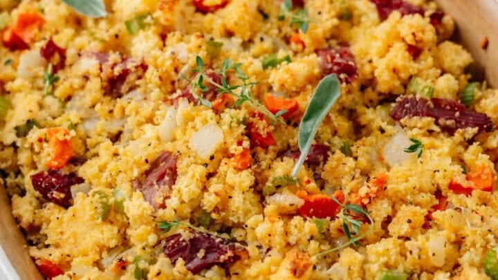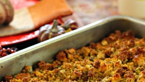 Crumbly cornbread, sausage, garlic, sage, and more make up this tasty side dish that goes along perfectly with sweet potato casserole and turkey.