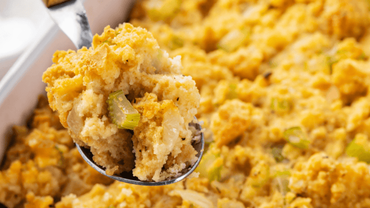 This cornbread recipe is easy, and it has tons of flavor. With only a few ingredients, the dressing will be perfect for the Thanksgiving menu, with cranberry sauce, sweet potatoes, and plenty of other sides.