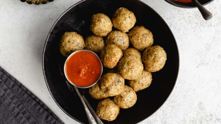 Air fryer chicken meatballs are tender and juicy, seasoned with a simple herb and spice blend, and made without breadcrumbs or parmesan cheese!