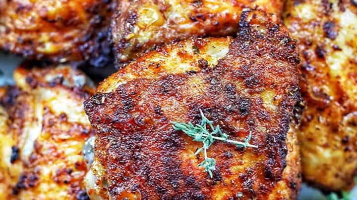 Air fryer chicken thighs with crispy seasoned skin are perfect for dinner. The recipe includes avocado oil, paprika, cumin, and more for tons of flavor.