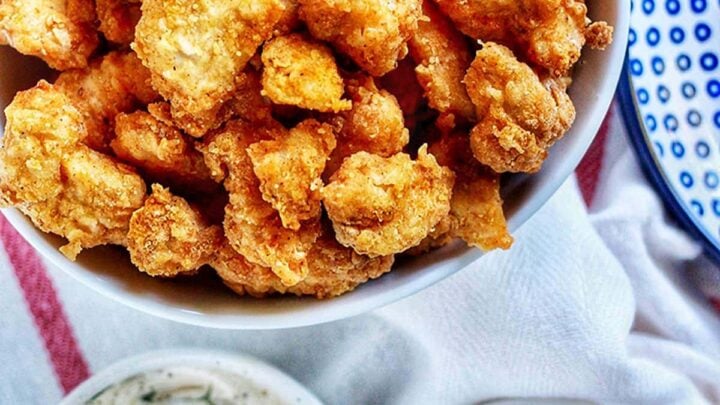 Crispy air fryer popcorn chicken is an easy and yummy dish the whole family will love. The quick meal is also perfect for game day and picnics.