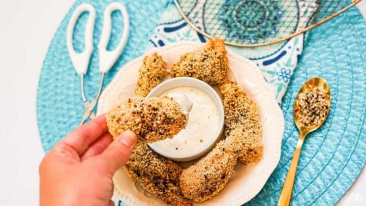 Everything bagel seasoning chicken fingers are super easy and quick to make using your air fryer. Everything bagel seasoning kicks up the flavor to make the zippiest, crispiest, and most delicious chicken fingers around.