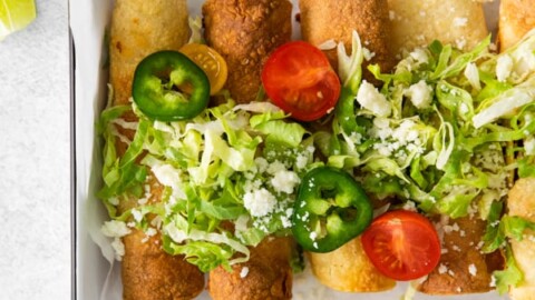 These homemade air fryer chicken taquitos are packed full of shredded chicken, cheese, and seasoning, all rolled up in a corn tortilla. Serve alone or topped with shredded lettuce, salsa, guacamole, sour cream, and sliced jalapeños.