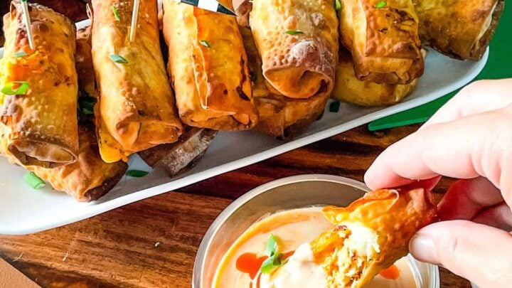 Buffalo chicken egg rolls made with Franks RedHot Sauce, Corelle, and Pyrex are a perfect game day appetizer or snack recipe! Chicken and cheeses are layered in this handheld party food recipe, perfect for your football party.