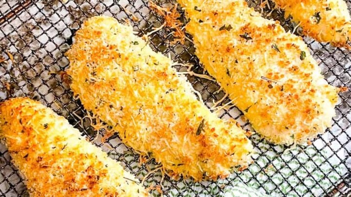 Parmesan air fried chicken tenders are a fast weeknight chicken dinner recipe made in the air fryer. A cheese breadcrumb coating makes these versatile and kid-friendly. And the best part? It's an easy beginner recipe.
