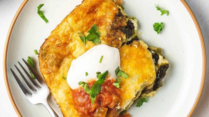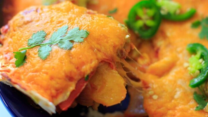 This cheesy vegetarian Mexican lasagna features layers of refried beans, sautéed veggies, melty Mexican cheese, enchilada sauce, and tortillas.