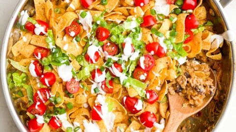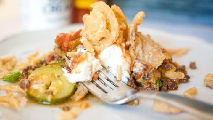 Walking Taco Casserole with Fritos has all the flavors of delicious tacos in an easy one pan dinner you can make in about 25 minutes. This is a quick, simple casserole recipe that tastes anything but.