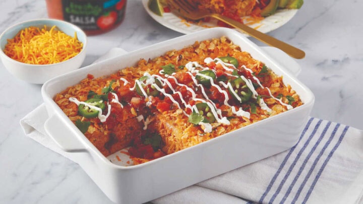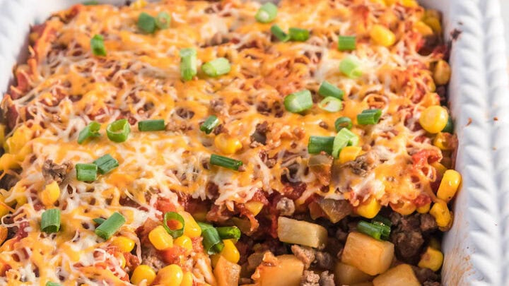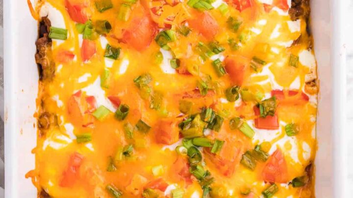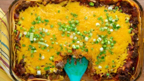 This easy casserole has all the ingredients we love about tacos, baked together in one convenient baking dish – quick to make and quick to clean up!