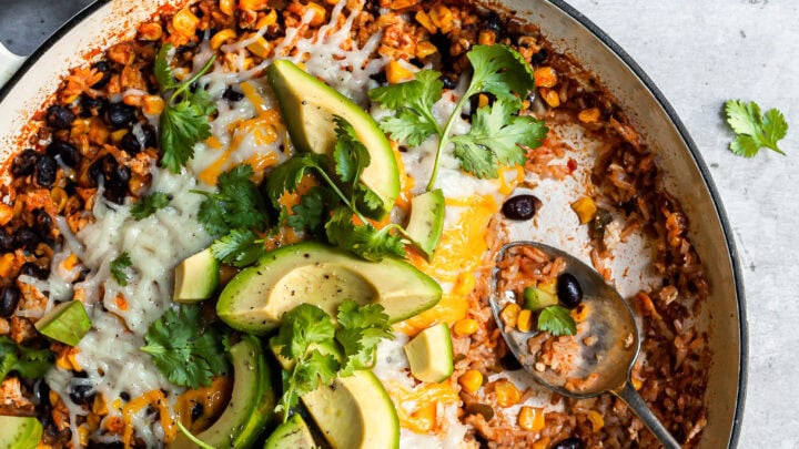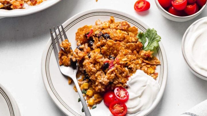 Making a delicious and healthy vegan meal does not get any easier than this Mexican-inspired rice casserole. Perfect for busy weeknights and filled with the goodness of beans, corn, and rice for a budget-friendly plant-based dinner!