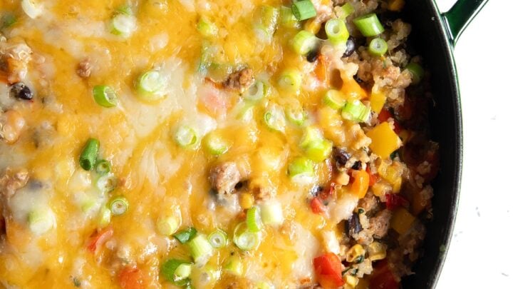 This Mexican Quinoa Casserole Recipe is an easy and delicious one-pan dinner perfect for busy weeknights! Filled with ground turkey, bell peppers, and pantry staples like canned black beans, corn, and tomatoes, the whole family will love this cheesy quinoa casserole.