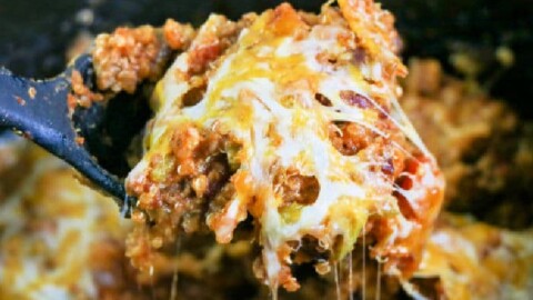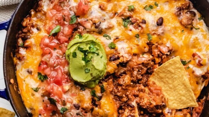 Our One Pot Cheesy Taco Skillet Recipe is keto-friendly, quick and easy to make, and a family favorite! Your keto taco pie sneaks in extra vegetables and is ready in just 30 minutes! It’s also perfect for burrito bowls, salads, and wraps. Grab your large skillet and get started!