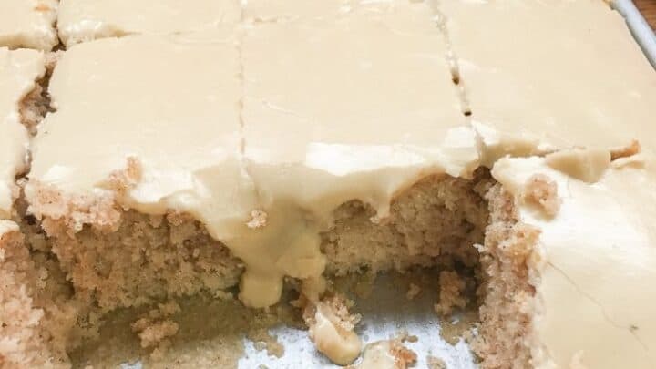 Buttermilk Texas sheet cake is the perfect cake for serving at a party. The recipe will feed a lot of people, and it's a sweet cake with cinnamon and buttermilk. And, the frosting is made with brown sugar, butter, milk, and powdered sugar that is to die for.