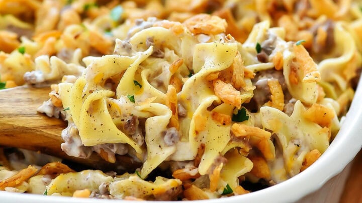 French onion beef casserole is a great recipe with only five simple ingredients including ground beef, noodles, dip, fried onions, and flavorful soup. The combination is a winning one and will go fast.