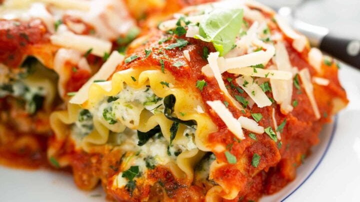 Lasagna rolls ups are a tasty main dish that will serve a crowd. The homemade recipe has all the favorites in lasagna including ricotta cheese, mozzarella, marinara sauce, and parmesan.
