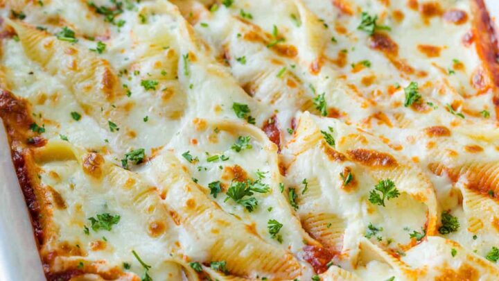 Stuffed shells are a cheesy and delicious recipe with mozzarella, ricotta, and parmesan cheese. The pasta dish is a great way to add another tasty dish to potluck meals.