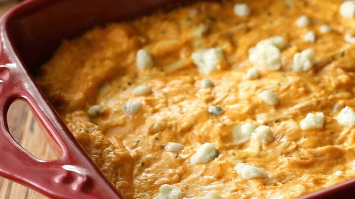 Buffalo chicken dip is a mouthwatering recipe with chicken, cream cheese, ranch dressing, buffalo sauce, all topped off with blue cheese crumbles. Grab some tortilla chips and start dipping.