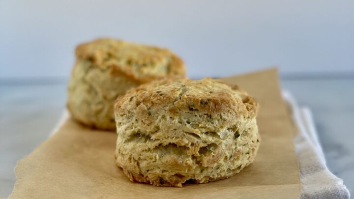 Sour cream and chive biscuits are a great side with a delicious meal of pork and veggies.