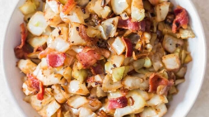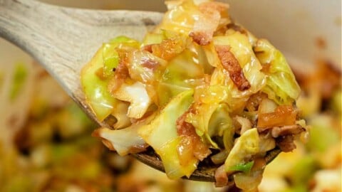 Southern-fried cabbage with bacon cooks in less than 20 minutes. Tender cabbage and crispy bacon cooked in amazing seasoning. The easiest side dish to throw together and cook.