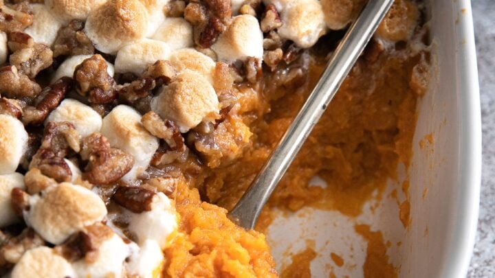 Traditional classic sweet potato casserole is made with smooth and creamy mashed sweet potatoes and topped with brown sugar, pecans, and gooey mini marshmallows. Everyone’s favorite sweet and savory sweet potato side dish is a must-have on any Thanksgiving table.