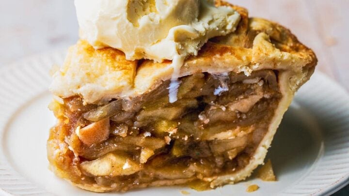 This deep dish, mile-high apple pie, is jam-packed full of sweet and tart apple slices in a spiced brown sugar filling, nestled in a super-flaky deep dish butter and leaf-lard pie crust that makes for the best traditional apple pie you'll ever have.