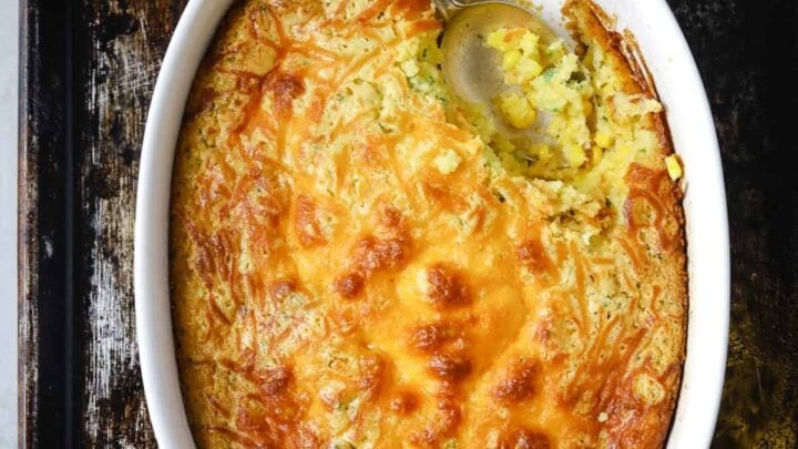 The very best cornbread pudding, also known as spoonbread, is made with fresh corn kernels, cheddar cheese, chives, jalapeño, and creme fraiche! Eat warm, right out of the oven with a smear of butter. I promise this recipe doesn’t disappoint!