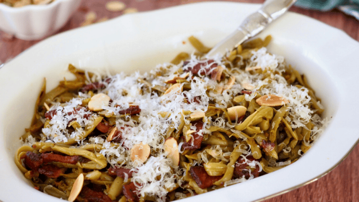 Super simple southern-style green beans are easy, delicious, and no oven necessary! Shallots, thick, crispy bacon, and creamy parmesan are topped with sliced almonds or fried onions. Or go crazy and do both.
