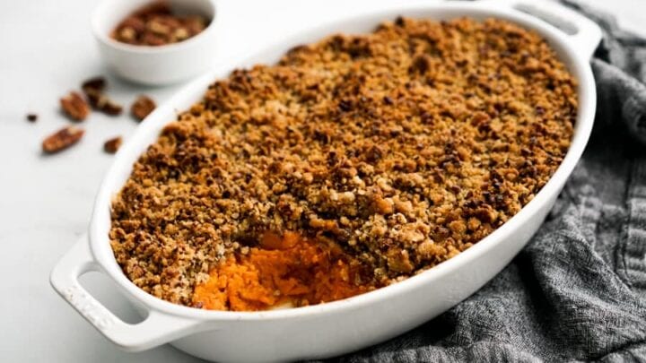 Sweet potato casserole with pecans are a classic Thanksgiving side dish! Mashed sweet potatoes are topped with a crumbly brown sugar pecan topping.