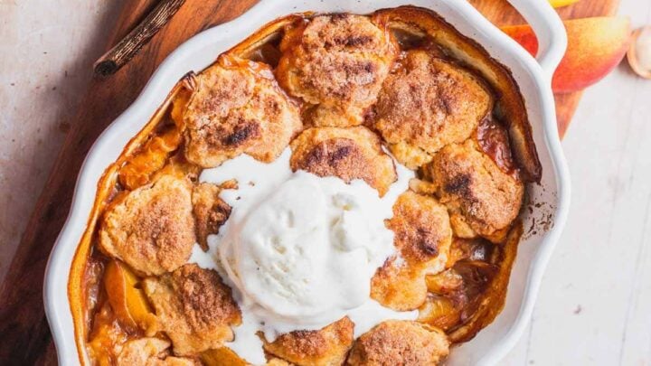 This is the best peach cobbler recipe; it's so fast, easy, and simple to make from scratch! Use canned peaches for ease or ripe fresh peaches in the summer. It's baked with a delicious cinnamon-sugar drop biscuit dumplings and spiked with a splash of bourbon, then topped with vanilla ice cream for the perfect southern dessert.