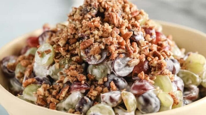 This family favorite southern grape salad requires only ten minutes of prep and a few ingredients to whip up! It is creamy, crunchy, and a great side dish that doubles as dessert.