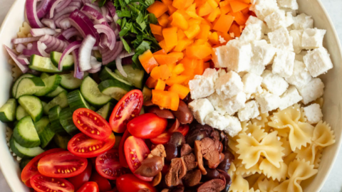 Greek pasta salad is the perfect side dish for any occasion, made with cooked pasta, fresh veggies, Kalamata olives, feta cheese, and homemade Greek salad dressing.