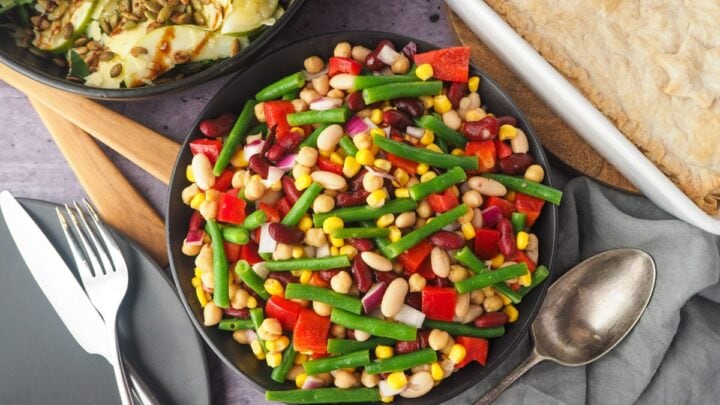 Quick and easy four bean salad is simple and delicious. With a tangy vinaigrette, it's perfect for a bbq, pot luck, or a picnic. Tuck in!