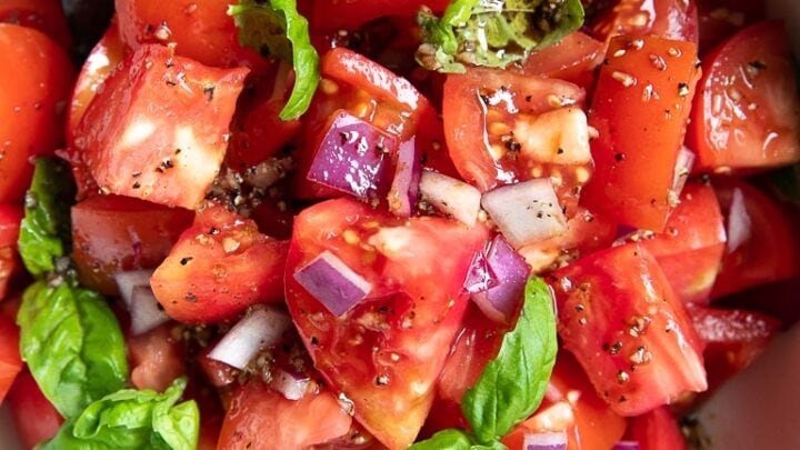 Made with garden-fresh tomatoes, spicy red onions, delicious sweet basil, and an easy three ingredient balsamic dressing, this tomato basil salad takes just ten minutes to prepare from start to finish.