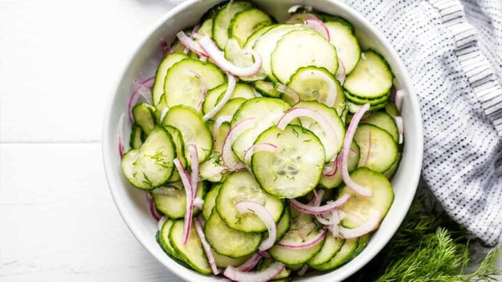 We love cucumber salads and this one from The Stay At Home Chef is super easy and delicious. You can serve the dish cold or at room temperature. And the recipe goes great with chicken nuggets and chicken fingers.