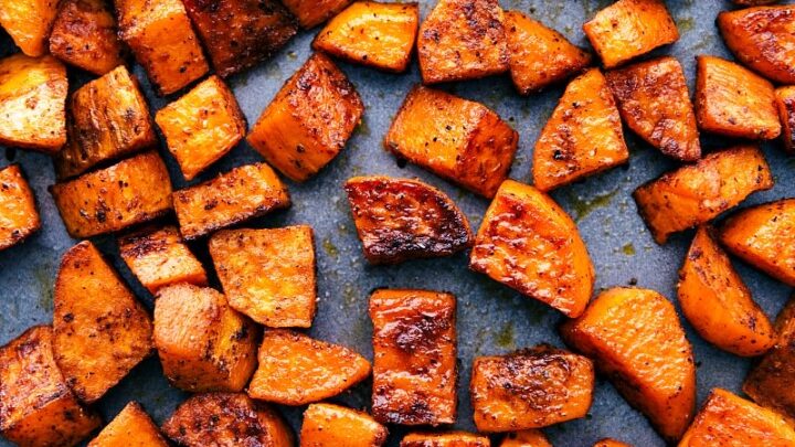 Roasted sweet potatoes are a great dish to add to your meal and are seasoned with paprika, cracked pepper, chili powder, ground cumin, and more for a super tasty dish.