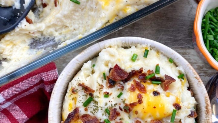 This simple casserole makes it easy to serve loaded mashed potatoes to a crowd. It’s cheesy and creamy, topped off with green onions and crispy bacon for the best side dish to go with your favorite wing recipe!