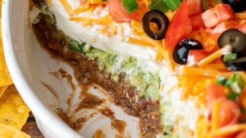 Just as the name suggests, there are 7 blissful layers of fantastic flavors in this dip. Guacamole, olives, refried beans, sliced black olives, and cheese are just a few you can drag your tortilla chips through to get all these flavors in every bite.